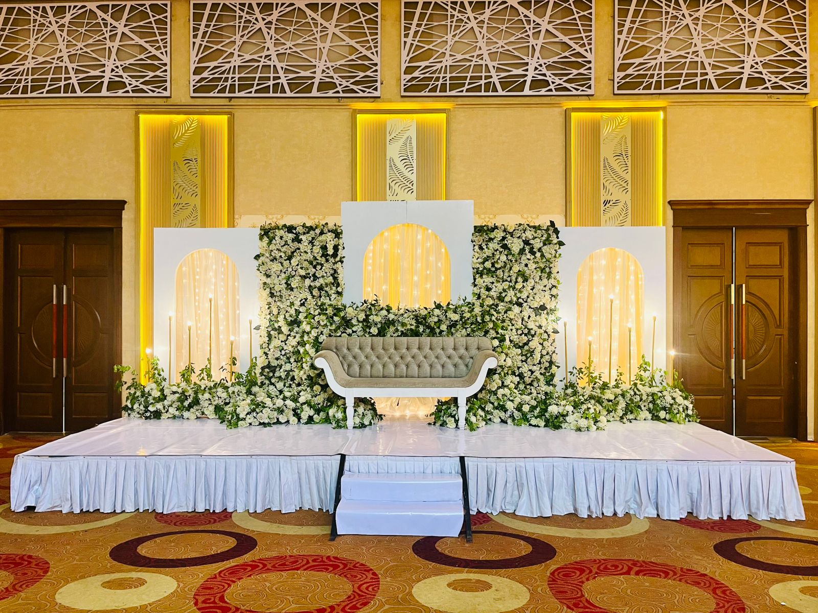 Elegant settee backs with beautiful floral decorations and sofas, perfect for adding style and charm to any event.